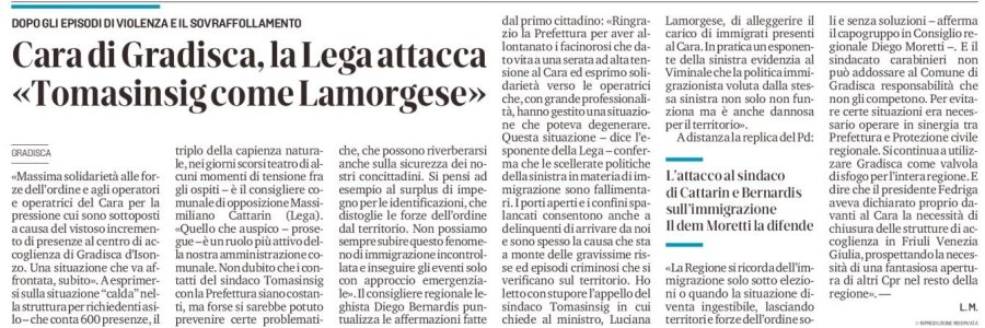 CARA GRADISCA. BERNARDIS (LEGA): SINISTRA IN CONFUSIONE, RISSE RISULTATO DI POLITICHE PRO IMMIGRAZIONE